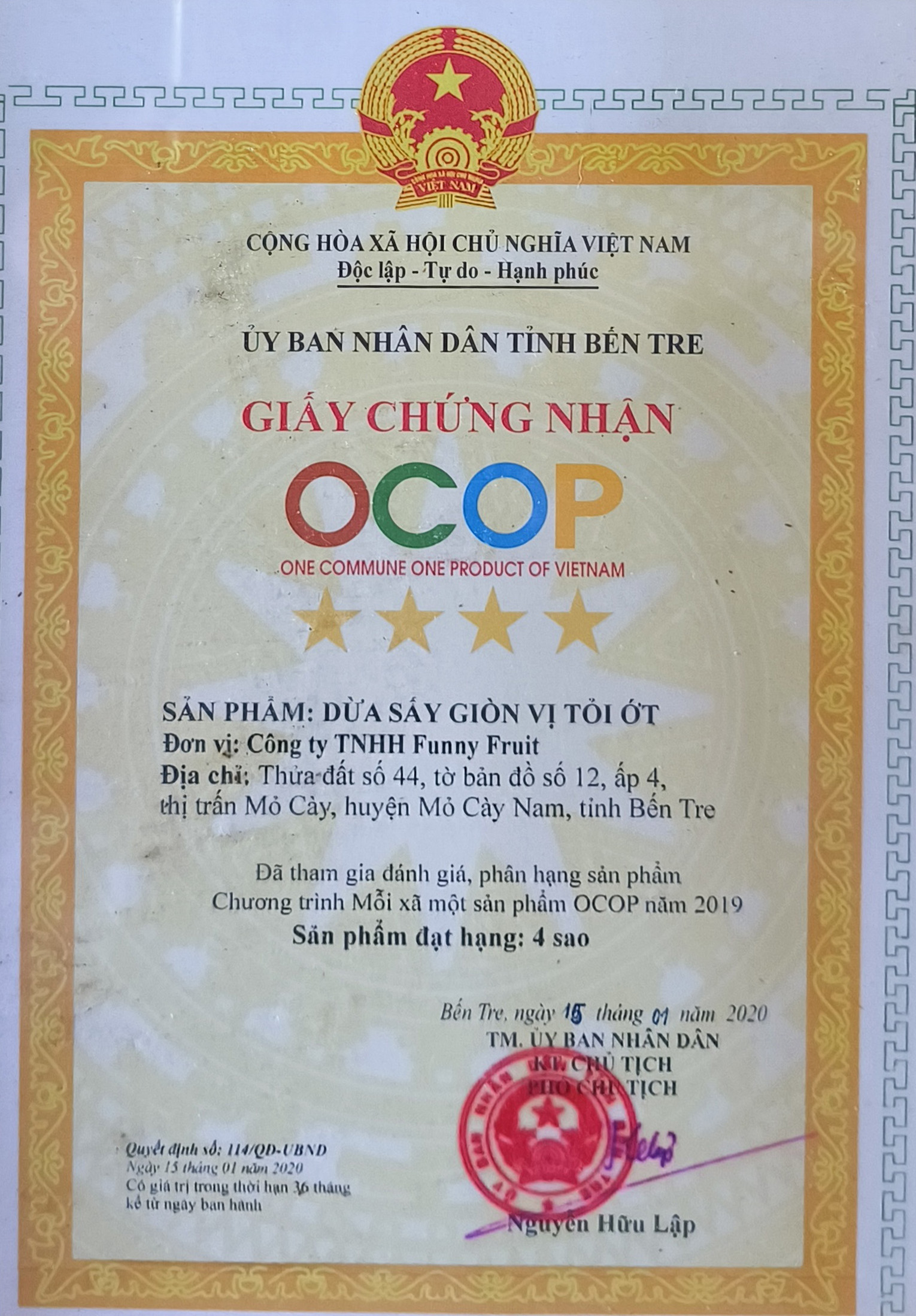 Funny Fruit đã có những thành công nhất định, sau hơn 3 tháng đi vào hoạt động, sản phẩm dừa sấy giòn của chúng tôi đã phủ gần khắp các tỉnh phía Tây, vinh dự là 1 trong 40 doanh nghiệp đạt chuẩn 3 sao OCOP và là sản phẩm tiêu biểu của Huyện.